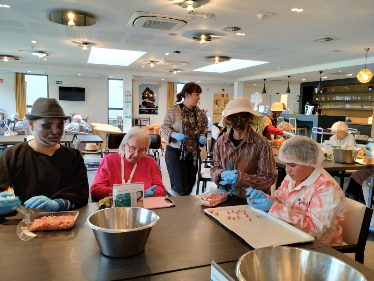 Ik heb een man geholpen met de spinnenkoppen: we steken stukjes spaghetti in gehaktballetjes.